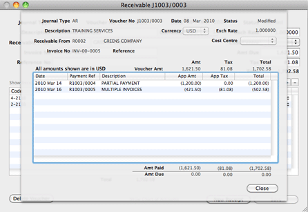 In the following example, invoice number INV-00-0005 has been settled in two different cheque receipts from Greens Company on different days, as seen in the following panel which appears when you click on "Show Receipts History".