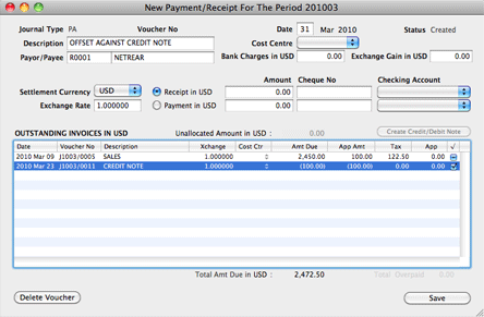 In the following example, a cheque amount of USD 2,100 is received from Netrear for the full settlement of invoice INV-00-0012. The actual invoice amount is USD 2,000, hence there is an over-payment of USD 100 by the debtor. By clicking the "Create Credit/Debit Note" button, a Credit Note is generated to record this over-payment.