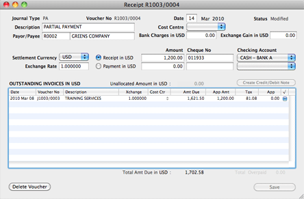Cheque Number 011933 for USD 1,200 is received for Voucher 0003. The amount to be settled for the invoice can be entered in the App (for, Applied) Amt column of the invoice record. Click on the App Amt column of the invoice once to enter the amount. The cheque will be banked into Bank A.