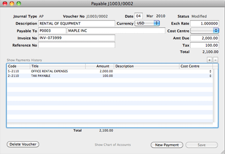 The following is an example of a payable entry. The invoice number INV-073999 for USD 2,100 (inclusive of USD 100 tax amount) was issued by Maple Inc, the company's vendor, for the rental of equipment.