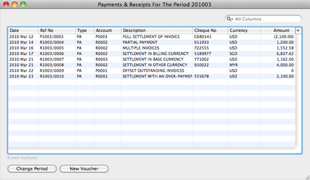 The Payments & Receipts window for the settlement of invoices can be launched in several ways. It can be launched from the Payable or Receivable screen by clicking the "New Payment" or "New Receipt" button in the screen. Alternatively, launch Journal > Payments & Receipts and click the "New Voucher" button for the settlement of multiple invoices.