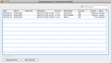 For cash receipts from one-off customers, or for receipts without an invoice, use Journal > Cash Receipts. Examples of such cash receipts are receipt of bank interest and cash sales.