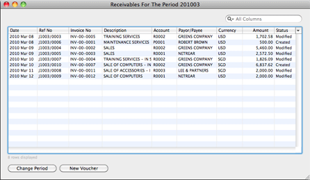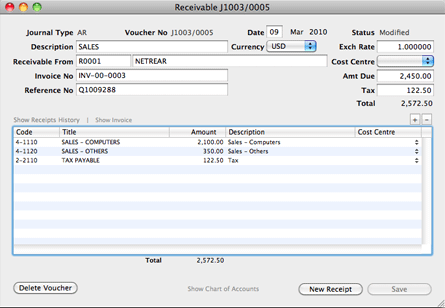 The following is an example of a receivable entry. The company issued a sale invoice (invoice number INV-00-0003) to its customer, Netrear (quotation number Q1009288), for its credit sales of computers and other items to Netrear. The invoice amount of USD 2572.50 includes a tax amount of USD 122.50.