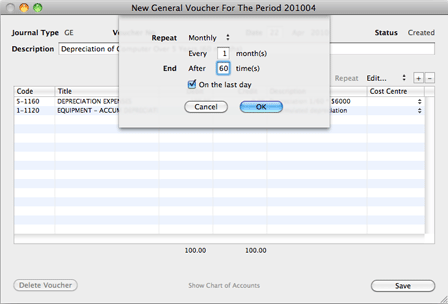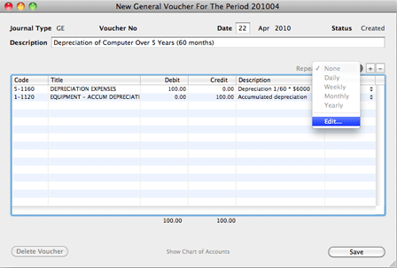 The recurring voucher is created as you would for a normal voucher. The parameters for generating recurring vouchers is configured by selecting the "Edit..." option from the pull-down menu for repeating a voucher.
