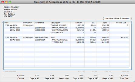 Double-clicking on the debtor's or creditor's aging record will get you the Statement of Accounts for that debtor or creditor. Alternatively, the Statement of Accounts can be launched by choosing Analysis > Statement of Accounts from the Menu Bar.