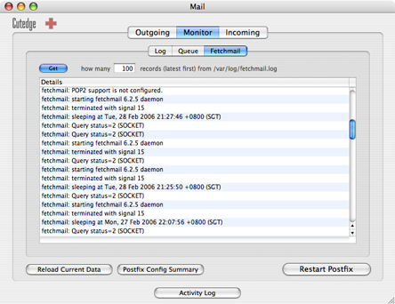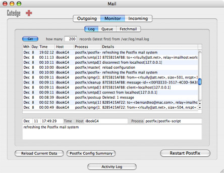 Note that you can print out both the mail log and the Postfix configuration summary. (Actually, you can print any piece of information by just clicking on it, to give it the focus, before doing a Print from the File menu.)