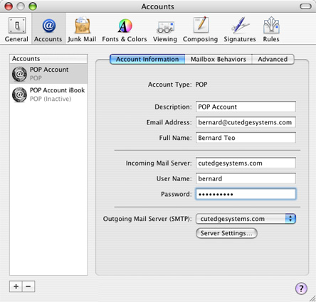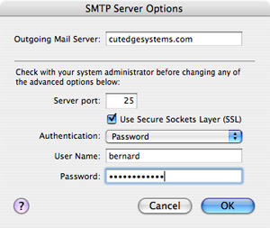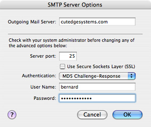 Assuming that my domain name is cutedgesystems.com, this is how I'll set up the mail client, OS X's Mail.app, on each user's machine. Test it first on the local machine, i.e., the same machine you're using to run your server.