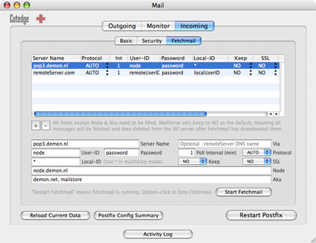 To set up Fetchmail, go to the Fetchmail tab, click the + button to add a POP or IMAP server to fetch mail from, enter the server name, leave protocol as AUTO, enter your user ID and password at this server, and your user name on your local server.