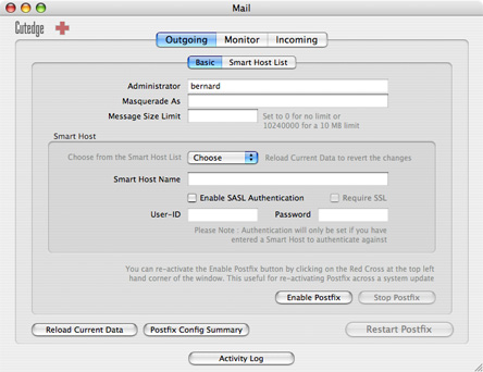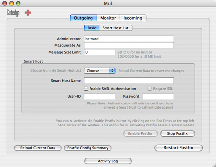 The Basic sub-panel, below, is where you start off. It allows you to turn on the Postfix SMTP server built into Mac OS X, which will allow you to send mail out the command line, from PHP or Perl scripts, or from Mac OS X applications like Mail, Eudora or Entourage.