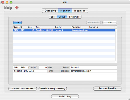 You can use this panel to monitor the mail queue. The Get button retrieves the mail queue. You can flush the queue or choose a particular message to delete - useful for when there are messages stuck in the queue.