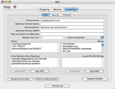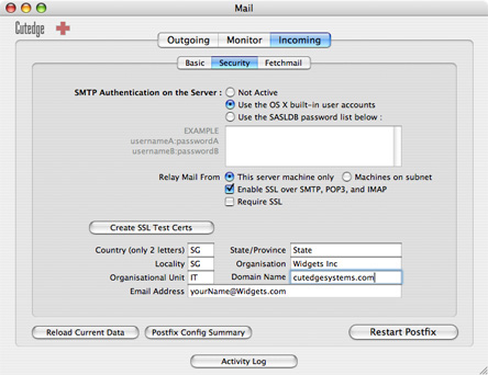 Once you've done this, click on Restart Postfix, and that's it. I've set up a mail server for the domain cutedgesystems.com and all machines on the same network as the server can send mail through it.