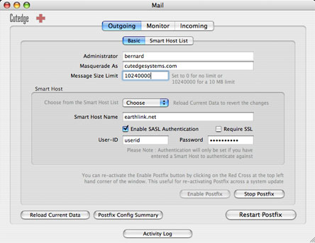 After you've made any of these changes, click the Restart Postfix button to effect the change. Then test that you can now send mail out your ISP network, by sending mail out via the command line, PHP or Perl script, or from a mail client like Mail or Eudora.
