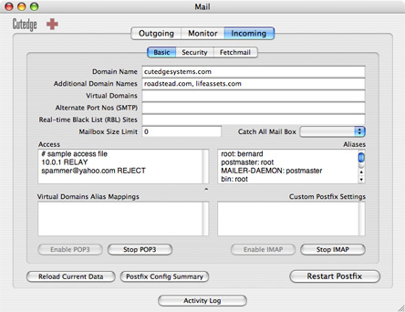The idea is that you use the Outgoing Mail tab to turn on OS X's built-in SMTP server, use the Monitor Mail tab to check that you can indeed send mail out your Mac, and then use the Incoming Mail tab to turn on the rest of the services that will make your Mac a full-fledged standards-compliant mail server, including providing support for POP3, IMAP and Fetchmail services.