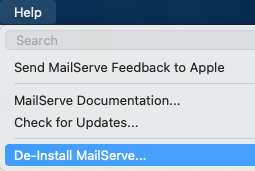 You can de-install MailServe by using the menu item, shown below, in the Help menu. It will shut down any mail-related service that is still running, and remove all files installed by MailServe.