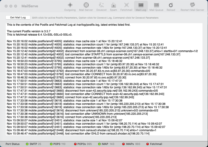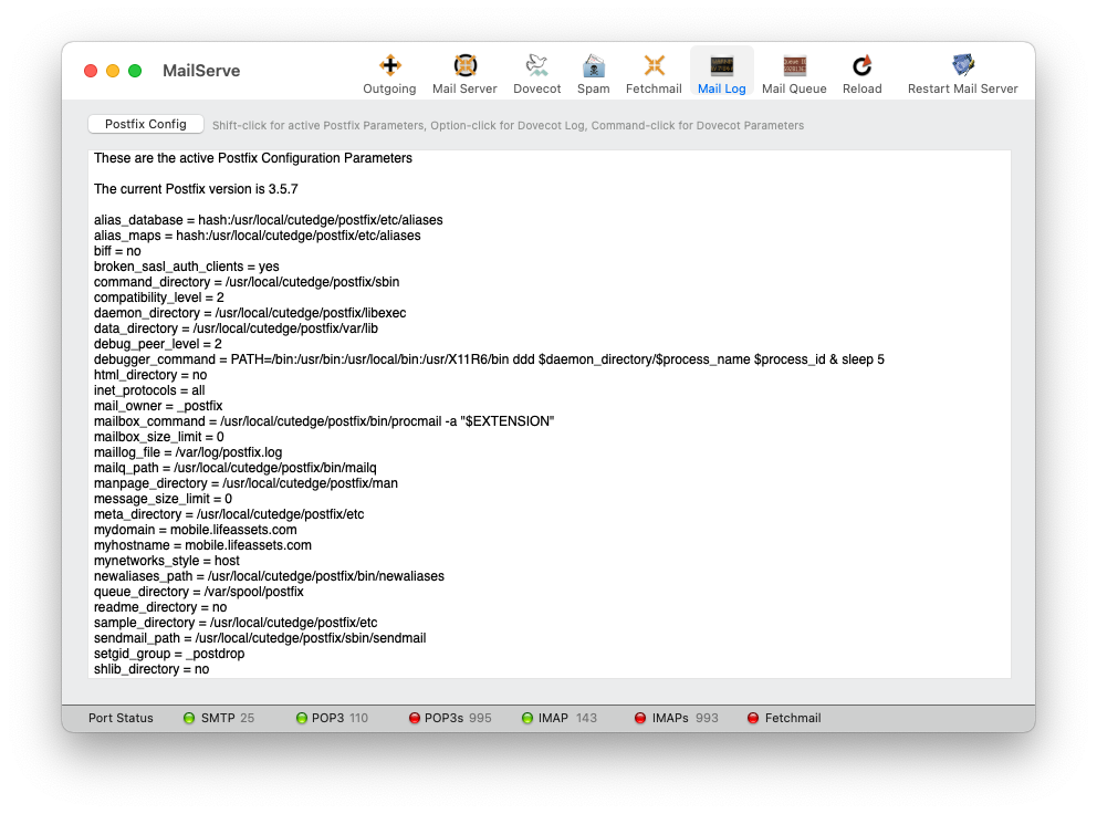 The Mail Log Panel provides access to the Postfix and Dovecot logs (Option-click for Dovecot log). It also shows the current versions of Postfix, Dovecot and Fetchmail that's installed by MailServe.