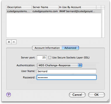 NOTE: New in MailServe for Mountain Lion 6.0.6 - the SASLDB authentication method now allows you to also use plain, login passwords (select Password instead of MD5 Challenge-Response in the pop-up menu, above), to support older mail clients that don't speak CRAM-MD5.
