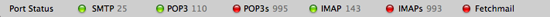 If you turn on POP3 and IMAP on Dovecot (ignoring their SSL variants for the moment), the Port Status lights on MailServer should look like that below :