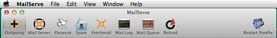 MailServe's Outgoing Mail Setup Panel can be reached via the first (extreme left) button on its Toolbar, below. Then, look for the Postfix button, at the opposite end (extreme right) of the Toolbar.