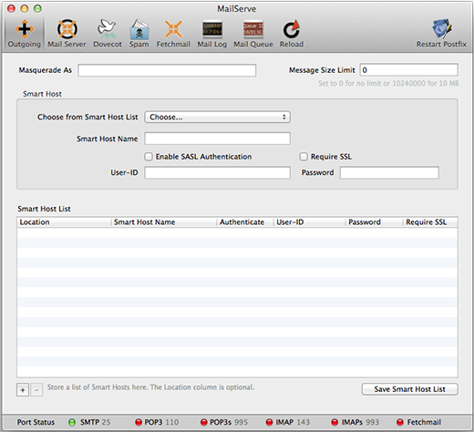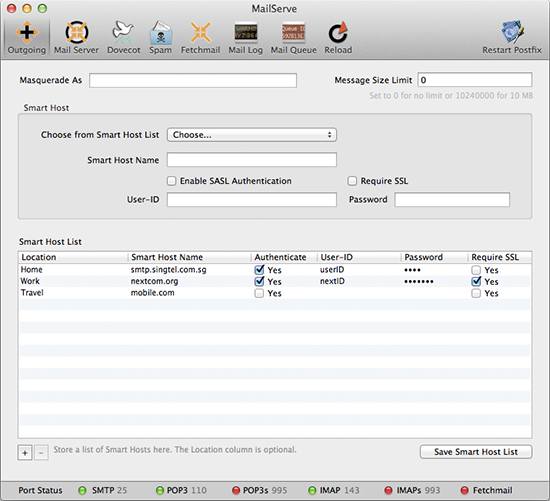 If you need to keep a list of Smart Hosts, for when you are on different networks or locations, store them in MailServe's Smart Host list. You can pick them up in the popup menu when you're setting the Smart Host.