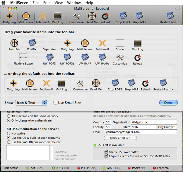 MailServe for Leopard now allows you to require all mail clients to turn on SSL when accessing their POP3 or IMAP mailboxes. This is implemented through having separate buttons for turning on SSL mode for POP3 and IMAP. You can find these buttons by clicking on the Customize function in the toolbar :