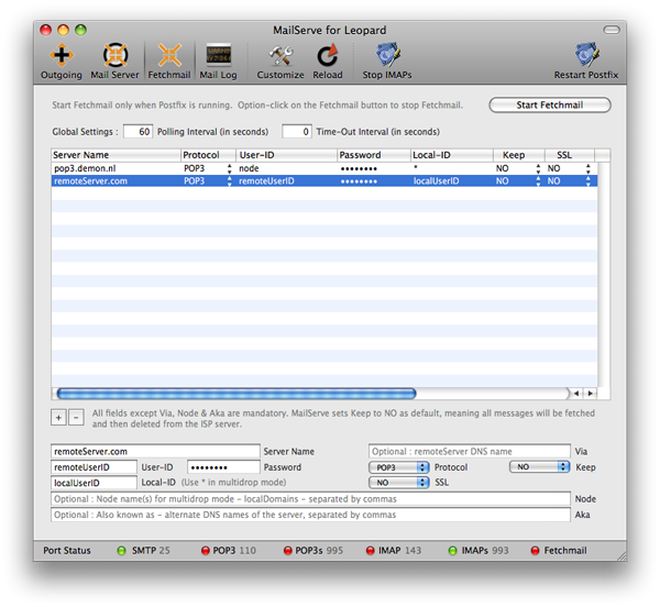Leave the Node and Aka fields empty, unless you want to set up Fetchmail to work in multi-drop mode whereby mail from one single mailbox at the ISP server is split by Fetchmail into multiple mailboxes at the local server.