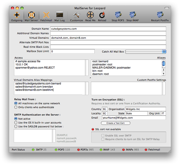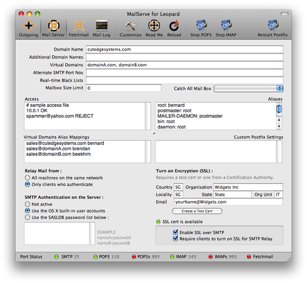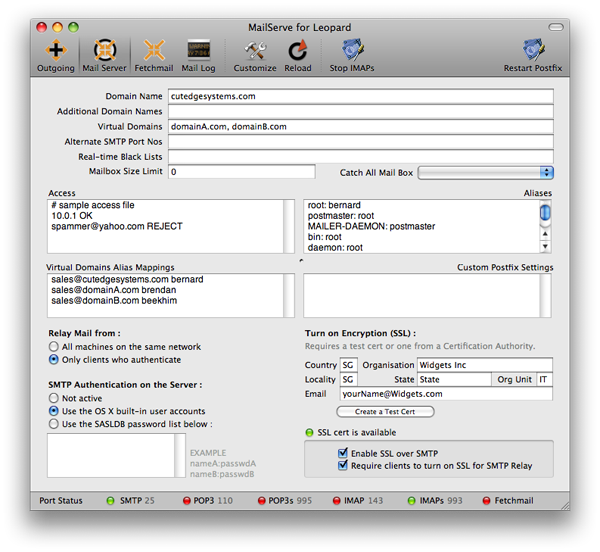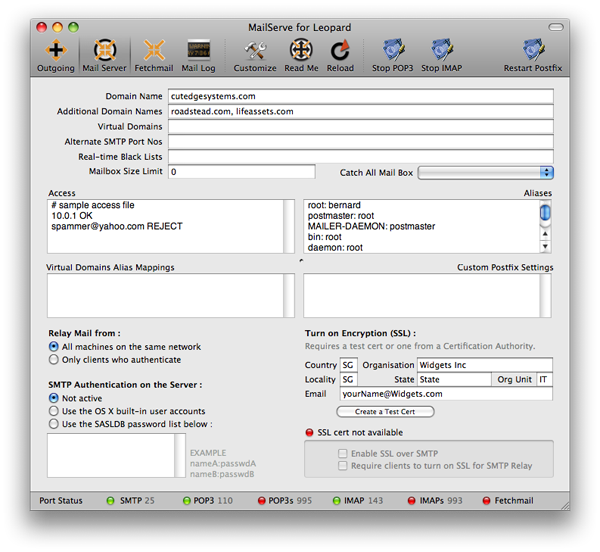 MailServe's customizable toolbar includes panels for setting the outgoing SMTP server parameters, the full mail server preferences, Fetchmail settings (if needed), and access to the mail log. There are separate buttons for turning on POP3 and IMAP, with or without SSL, in case there is a need for enforcing SSL-only connections from mail clients. There is also a new Port Status bar at the bottom of the window, to give a visual indication as to whether MailServe has successfully opened up the relevant ports for listening to connections.