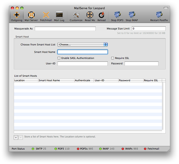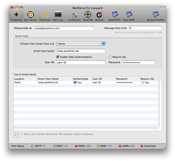 After you've made any of these changes, click the Restart Postfix button to effect the change. Then test that you can now send mail out your ISP network, by sending mail out via the command line, PHP or Perl script, or from a mail client like Mail or Eudora. Make sure that the port status light for SMTP is green.