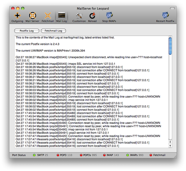 If Postfix has been successfully started, its toolbar button changes its label to Restart Postfix, and the Port Status bar lights up for SMTP port 25. You can always Stop Postfix by option-clicking on the toolbar button.