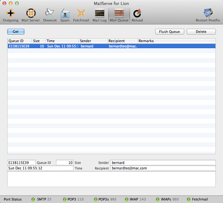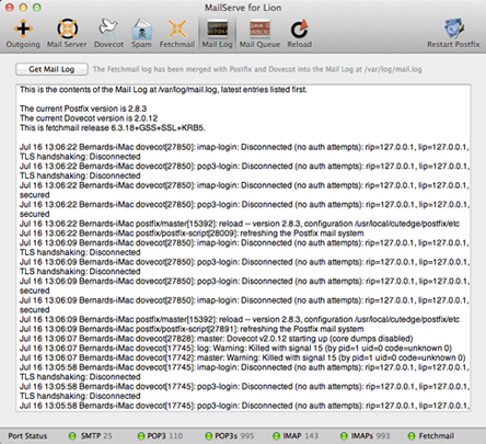 . Release Log 5.0 July 14 2011. MailServe for Lion released with version 2.0.12 of Dovecot. 5.0.1 July 24 2011. Updated Dovecot to the latest current 2.0.13. Fixed two problems with Dovecot. Dovecot can now allow SSL ports (995 and 993) to be opened without requiring the corresponding default ports (110 and 143) to be opened, too (so that you can force a user to connect to Dovecot only via SSL). Also, restored Dovecot's ability to support custom port numbers for POP and IMAP. Please remember to save your config, do a de-install from MailServe's Help menu, re-open the saved config, and then restart all the services, in order to get these latest Dovecot binaries. |