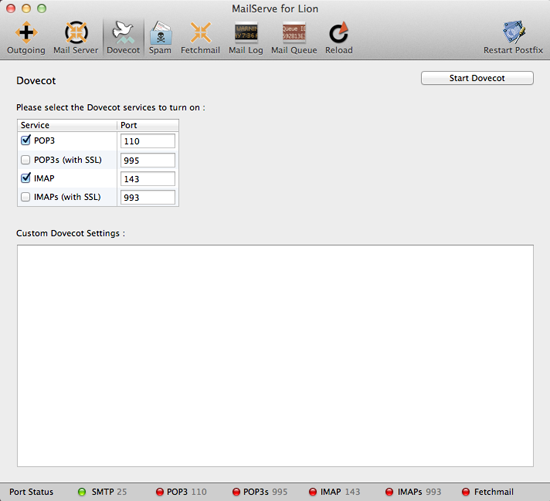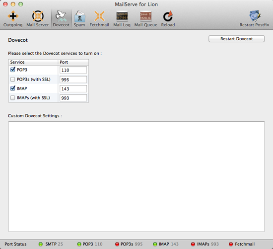 The POP3 and IMAP port status indicator lights will come on if the respective service has been successfully turned on. If you need to change the configuration later on, remember to click on the "Restart Dovecot" button to make it stick.