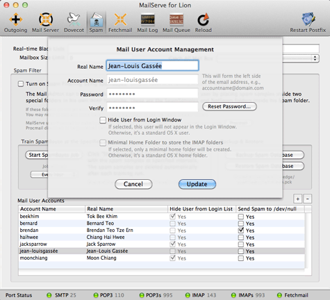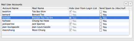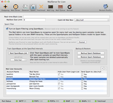 The Spam panel contains a Mail User Management utility, which allows the administrator to create or delete mail users, set passwords, and decide if they are to be standard OS X users, or users with a minimal home folder (to store the IMAP folders) who are hidden from the OS X Login Window.
