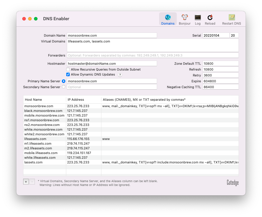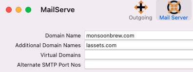 However you must make sure to also set up the DKIM TXT records for each of these extra domains at their respective name servers. The picture below shows the domains listed in MailServe being managed by DNS Enabler. Notice that both the main domain, monsoonbrew.com, and the “additional” domain, lassets.com, need to have DKIM TXT records created. You get the contents of the DKIM TXT record from the Public Key field in the DKIM dialog box (accessible from the Outgoing panel) in MailServe. You can use the same public key for both domains.