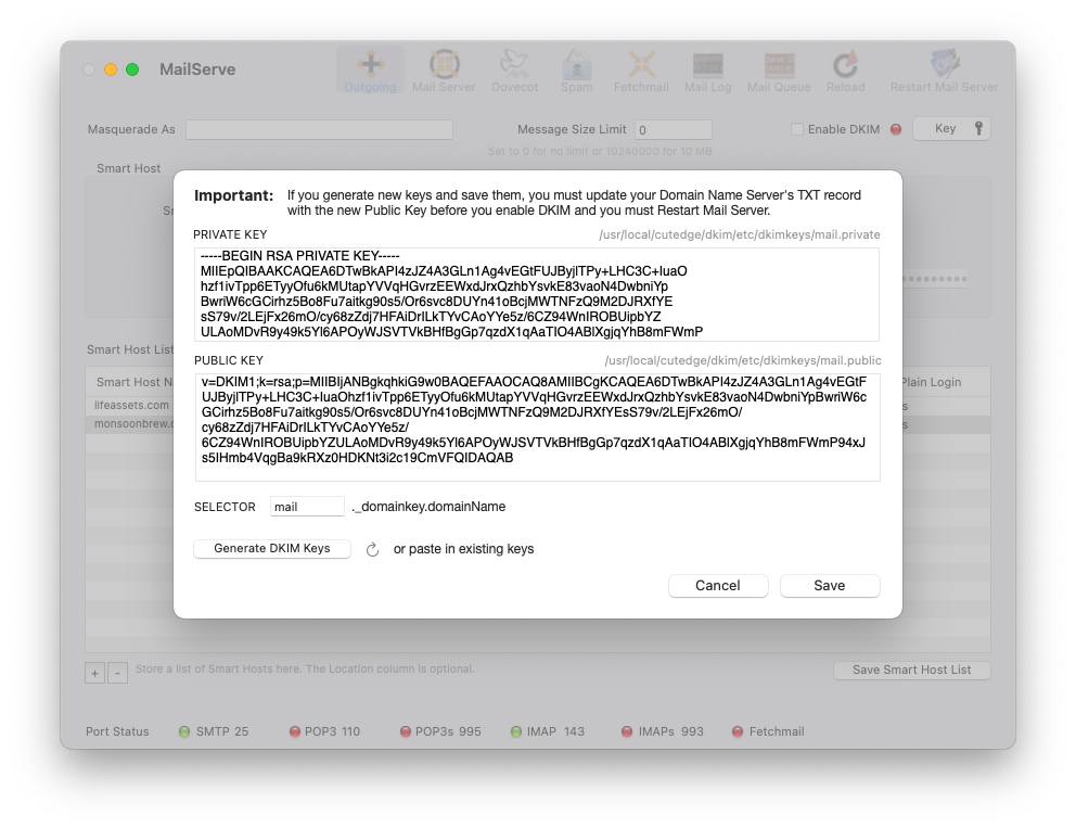 Be aware that it may take time for these new TXT records to propagate thorugh the Domain name System - so DKIM on MailServe may take a while to work, while waiting for the DNS records to propagate.