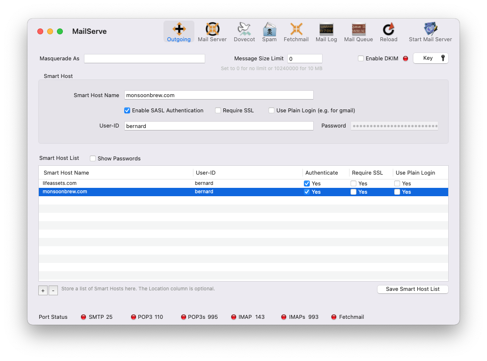 If you need to save a list of Smart Hosts, for when you are on different networks or locations, store them in MailServe's Smart Host list.