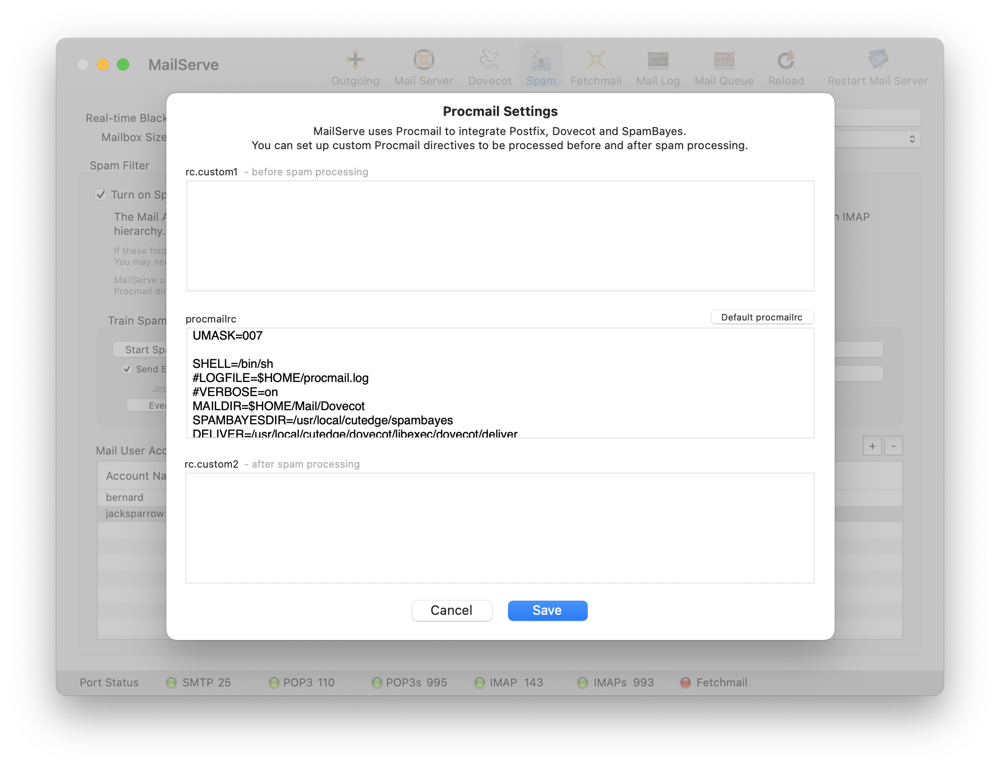 There is a Procmail button in the Spam Panel that will allow the administrator to set up custom Procmail directives to be processed before or after spam filtering. The administrator can also edit the default procmailrc directives, with the option to revert to default if the custom edits do not work.