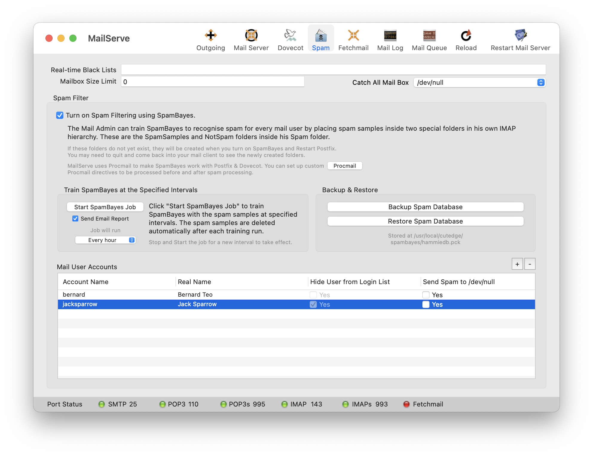The Spam panel contains a Mail User Management utility, which allows the administrator to create or delete mail users, set passwords, and decide if they are to be standard OS X users, or users with a minimal home folder (to store the IMAP folders) who are hidden from the OS X Login Window.