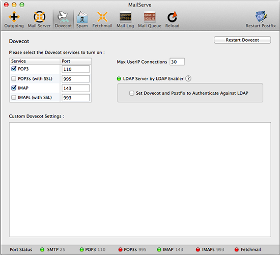The POP3 and IMAP port status indicator lights will come on if the respective service has been successfully turned on. If you need to change the configuration later on, remember to click on the "Restart Dovecot" button to make it stick.