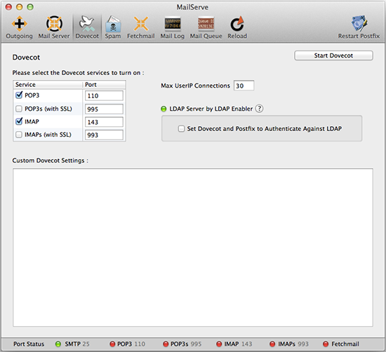 Choose whether you want the Dovecot POP3 or IMAP or both servers to be turned on. Additionally, you can set custom port numbers but, for the start, leave them at the default values. Click the Start Dovecot button.