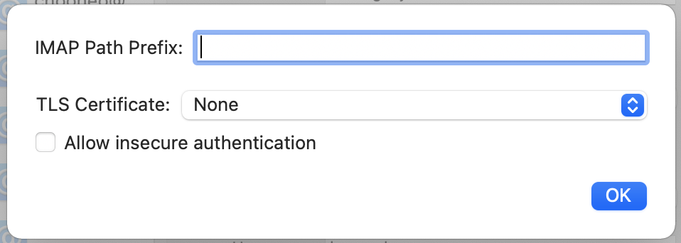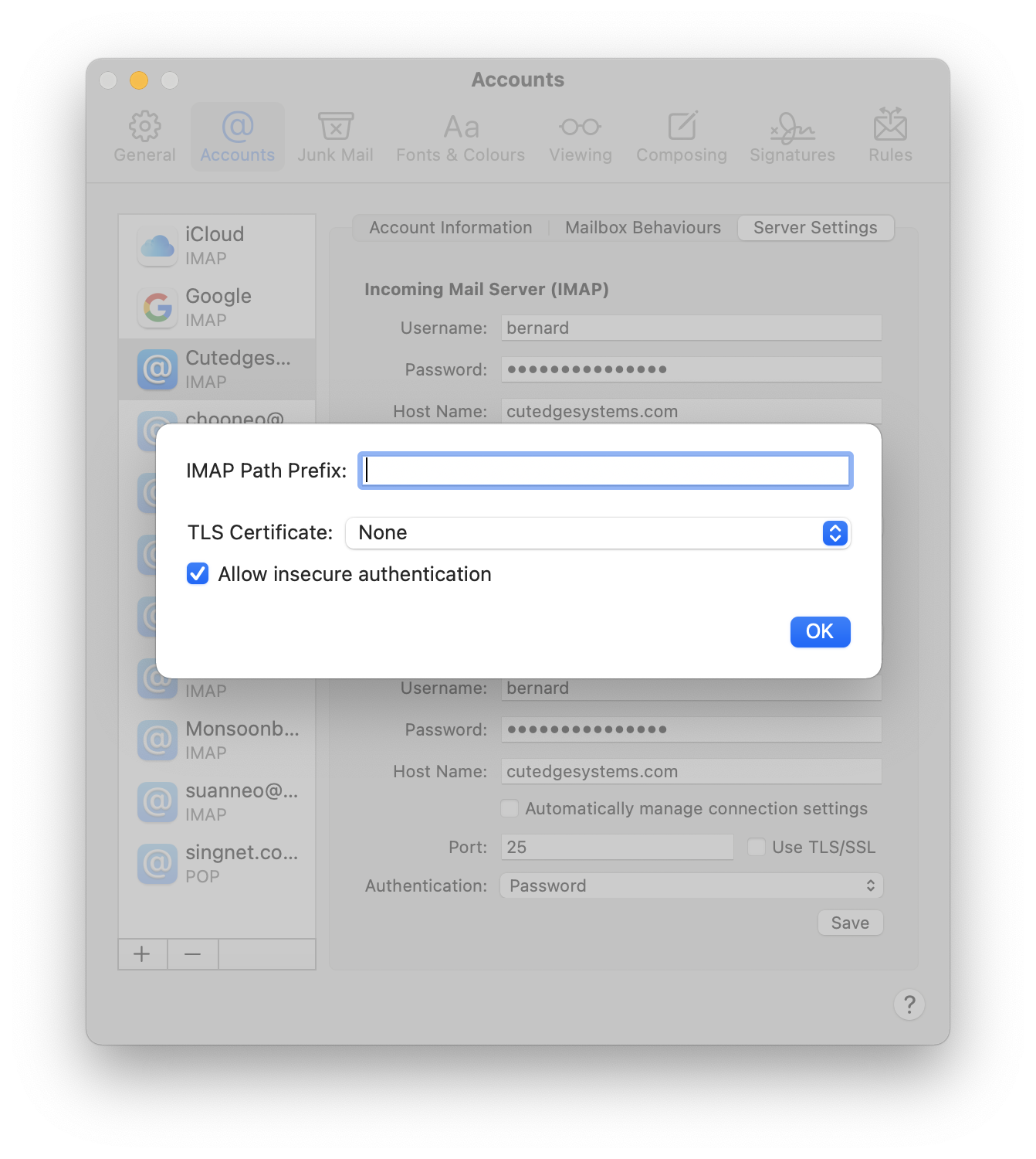Click the “Allow insecure authentication” check box (because we hadn’t turned SSL on and so all our communication with the mail server would be insecure, but that’s all right for the moment — we can turn on SSL later).