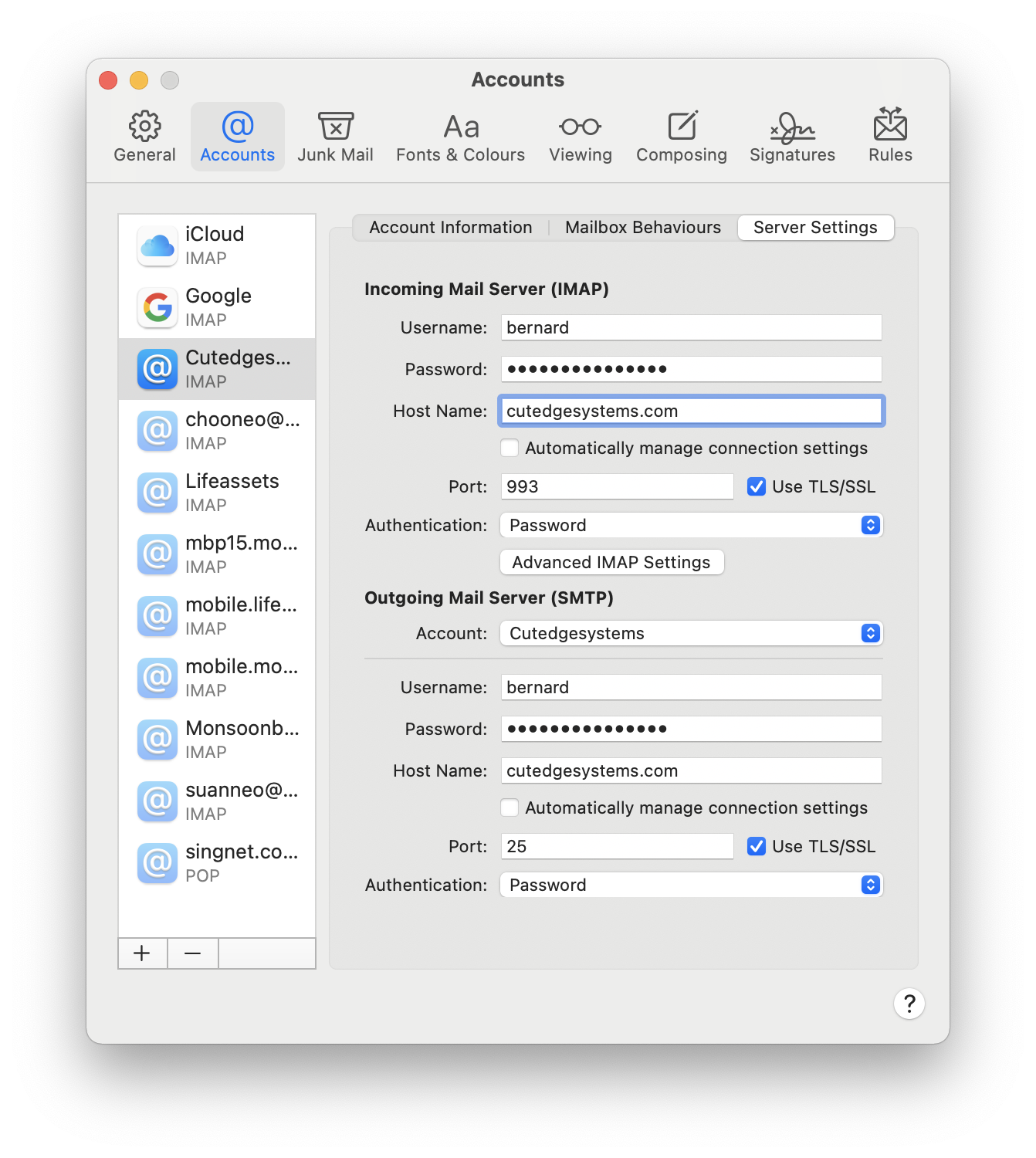 Assume also that the domain name is "cutedgesystems.com" and the mail user's account name is "bernard" (which is the MacOS short name as created using the Accounts Pane in System Preferences).