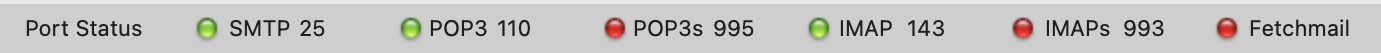 If you turn on POP3 and IMAP on Dovecot (ignoring their SSL variants for the moment), the Port Status lights on MailServer should look like that below :