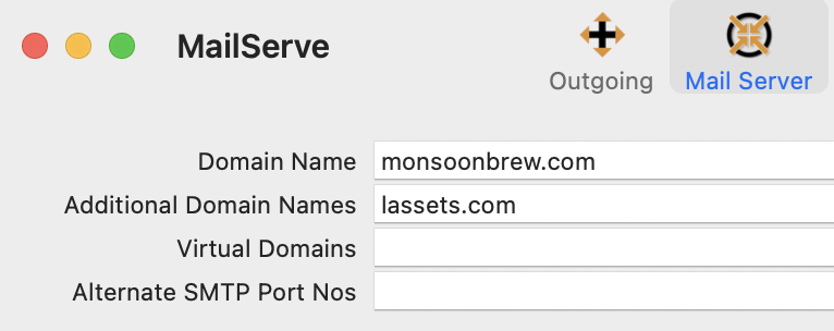 However, and this is very important, you must also make sure to have set up the DKIM TXT records for each of these domains at their respective name servers. The picture below shows the domains listed in MailServe being managed by DNS Enabler. Notice that both the main domain, monsoonbrew.com, and the “additional” domain, lassets.com, need to have DKIM TXT records created.