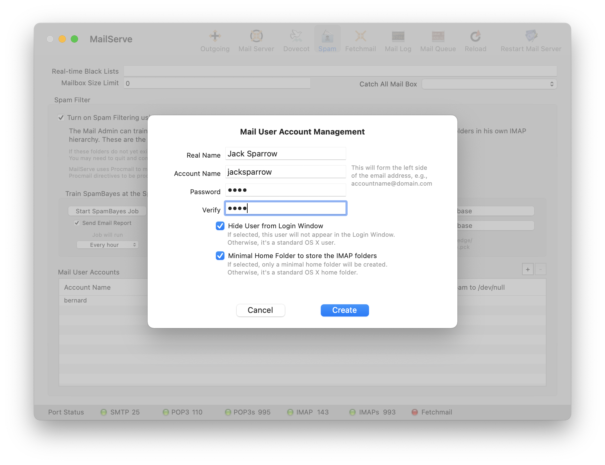 The Spam panel contains a Mail User Management utility, which allows the administrator to create or delete mail users, set passwords, and decide if they are to be standard OS X users, or users with a minimal home folder (to store the IMAP folders) who are hidden from the OS X Login Window.