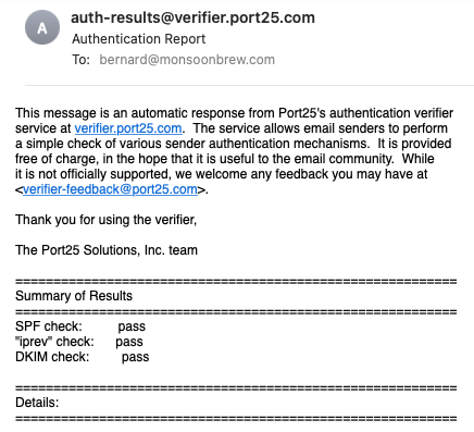The Enable DKIM checkbox can now be selected. Select it and Restart Mail Server. The DKIM indicator light should turn green (check the Activity Monitor app for a process called opendkim, to prove that dkim is running). You can now test that your mail server is DKIM-enabled. Send a test message to check-auth@verifier.port25.com from your now DKIM-enabled mail server. If DKIM works, you will see a reply coming back like this :