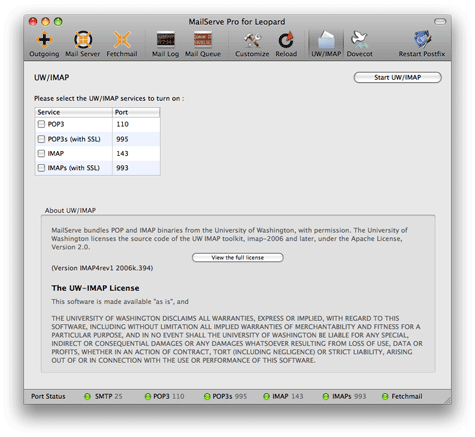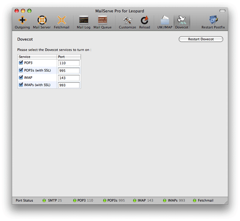 | Dovecot This is the new Dovecot panel. It allows you to choose which Dovecot services, including their SSL variants, to turn on. It also allows you to set which port numbers are to be used for each service. If left blank, the default ports will be used. For your convenience, if you start Dovecot while UW/IMAP is on, MailServe will turn off UW/IMAP automatically before turning on Dovecot. UW/IMAP This also works the other way round. If Dovecot is running and you Start UW/IMAP, MailServe will close down Dovecot first before starting UW/IMAP. There is one exception and this is to help users run both Dovecot and UW/IMAP at the same time in order to transfer mailboxes from UW/IMAP to Dovecot. If you set Dovecot to use ports other than the default, you can have Dovecot running and still have the ability to force-start UW/IMAP, which will use the default ports. You do this by holding down the Shift-Key when you Start UW/IMAP while Dovecot is running. But you must have Dovecot running on the non-default ports. You can always set Dovecot back to the default ports after you have transferred over all you mailboxes to Dovecot and don't need UW/IMAP anymore, in which case you should Stop UW/IMAP, set Dovecot back to the default ports and Restart Dovecot. The UW/IMAP buttons in MailServe for Leopard have been consolidated into one UW/IMAP panel in MailServe Pro, as shown below :  Why is Dovecot Good? Roland Sambain says, Christian Noack says, Another Benefit - Multiple Levels of IMAP Sub-folders Dovecot also allows Mail.app to work with multiple levels of IMAP sub-folders, as shown below, and that's a more powerful way of working with your mail storage:  Tech Notes Dovecot's IMAP folders on the server are stored in each user's ~/Mail folder. The Inbox is also stored in the ~/Mail folder. UW/IMAP's folders are in each user's ~/Library/Mail/IMAP folder. And its Inbox is in /var/mail. Release Notes April 27th 2008. Version 4.0 of MailServe Pro for Leopard was released as a Universal Binary for Mac OS X Leopard. October 27th 2008. Version 4.0.1. This solves a problem with the Fetchmail Log getting too big with time. In this version, Fetchmail logs its activity in the System Log, which does get archived and rotated. You can still view the Fetchmail-related activity in the System Log using MailServe Pro's Log Panel. From this point on, /var/log/fetchmail.log is not used and can be deleted to reclaim disk space. |