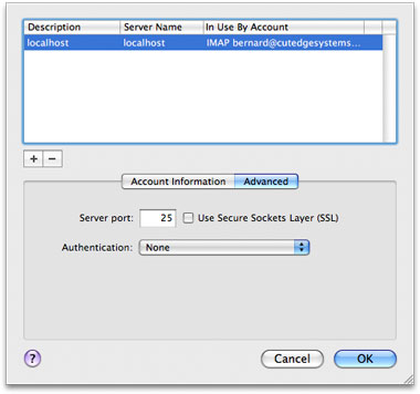 The Incoming Mail Server is any POP or IMAP server that I currently use. The important setting is for the Outgoing Mail Server (SMTP), below, which I've set to "localhost", localhost being the correct technical term for the local server.