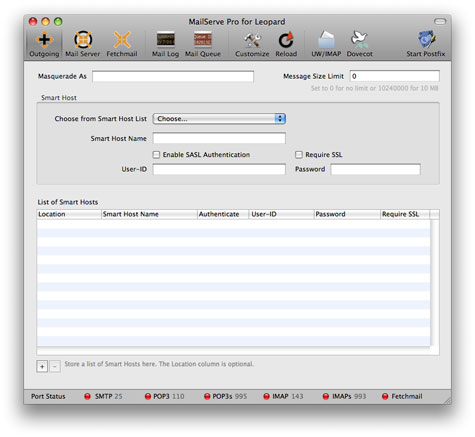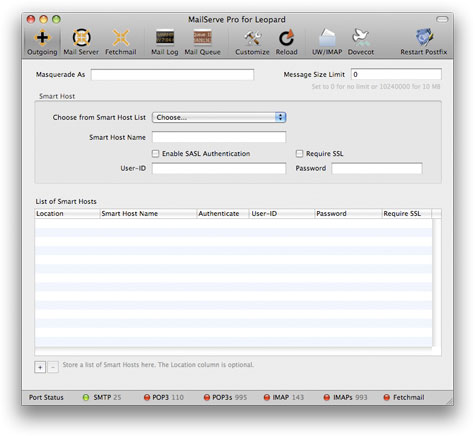 If you need to keep a list of Smart Hosts, for when you are on different networks or locations, store them in MailServe's Smart Host list. You can pick them up in the popup menu when you're setting the Smart Host.