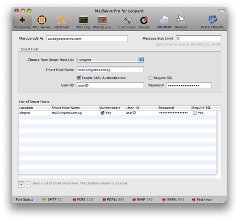Note : if the Smart Host needs to be contacted on a port other than 25, add the port number after the Smart Host name, after a colon. Like this : mail.singnet.com.sg:587