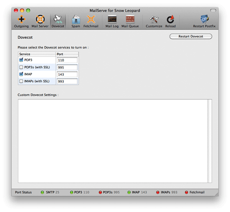 The POP3 and IMAP port status indicator lights will come on if the respective service has been successfully turned on. If you need to change the configuration later on, remember to click on the "Restart Dovecot" button to make it stick.