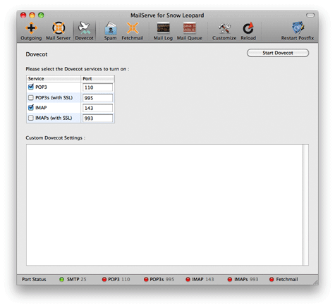 Choose whether you want the Dovecot POP3 or IMAP or both servers to be turned on. Additionally, you can set custom port numbers but, for the start, leave them at the default values. Click the Start Dovecot button.
